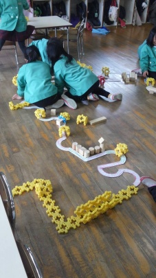 3月の絵本『みんなともだち』の付録をみんなでつなげて、大きな街を作って遊んでいますヾ(*´∀`*)ノ